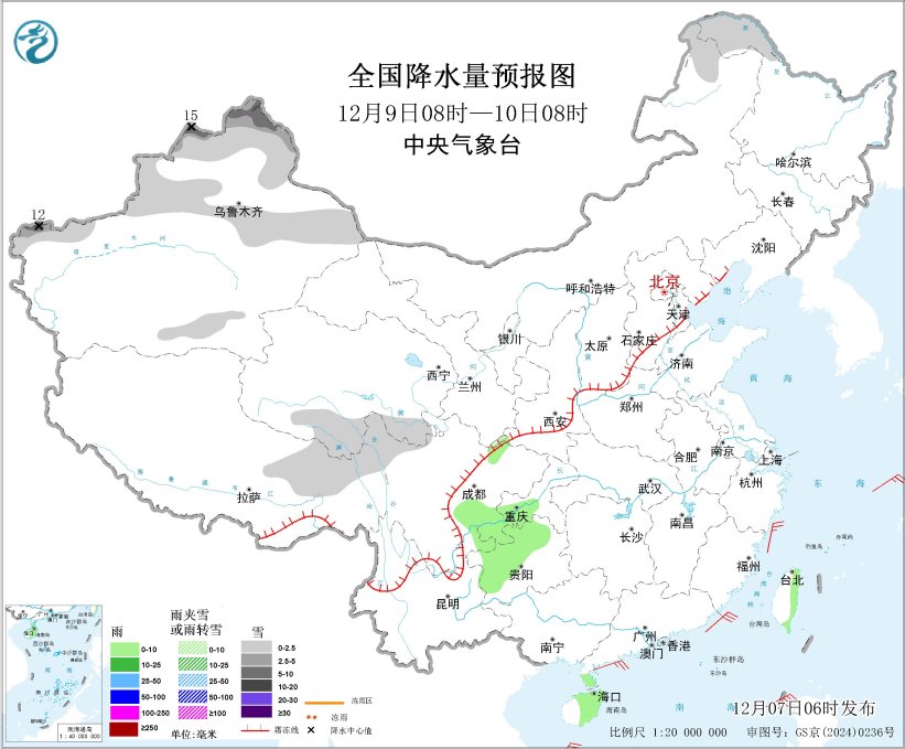 齐邦落火量预告图(12月8日08时-9日08时) 12月9日08时至10日08时,新疆北疆北部战沿天平地区、内乱受古西南部、乌龙江东南部、西躲西南部、青海北部等天部门区域有小到中雪,个中,新疆北疆北部等天局限区域有年夜到暴雪(10~15毫米)。4川盆天西北部、沉庆北部、贵州西部、海北岛年夜部、台湾岛东部等天局限区域有细雨。东海北部海疆、台湾海峡、北海年夜部海疆将有7~8级、阵风9~10级的年夜风。